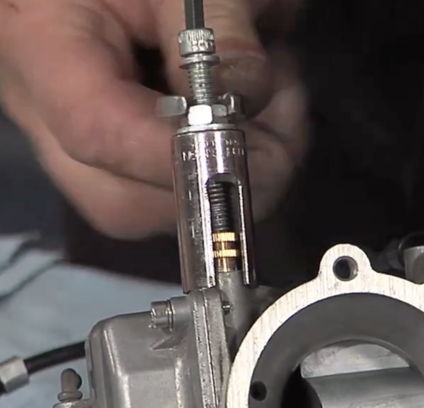 With the original carburetor fuel inlet fitting removed, lube the replacement fitting with a light wipe of green or blue Loctite. Then, patiently tap/press into place with a brass hammer. Make sure that the fitting is pointing in the same direction as the original. It is important that the carburetor fuel inlet fitting remains straight and is driven into the carburetor until it is bottomed.