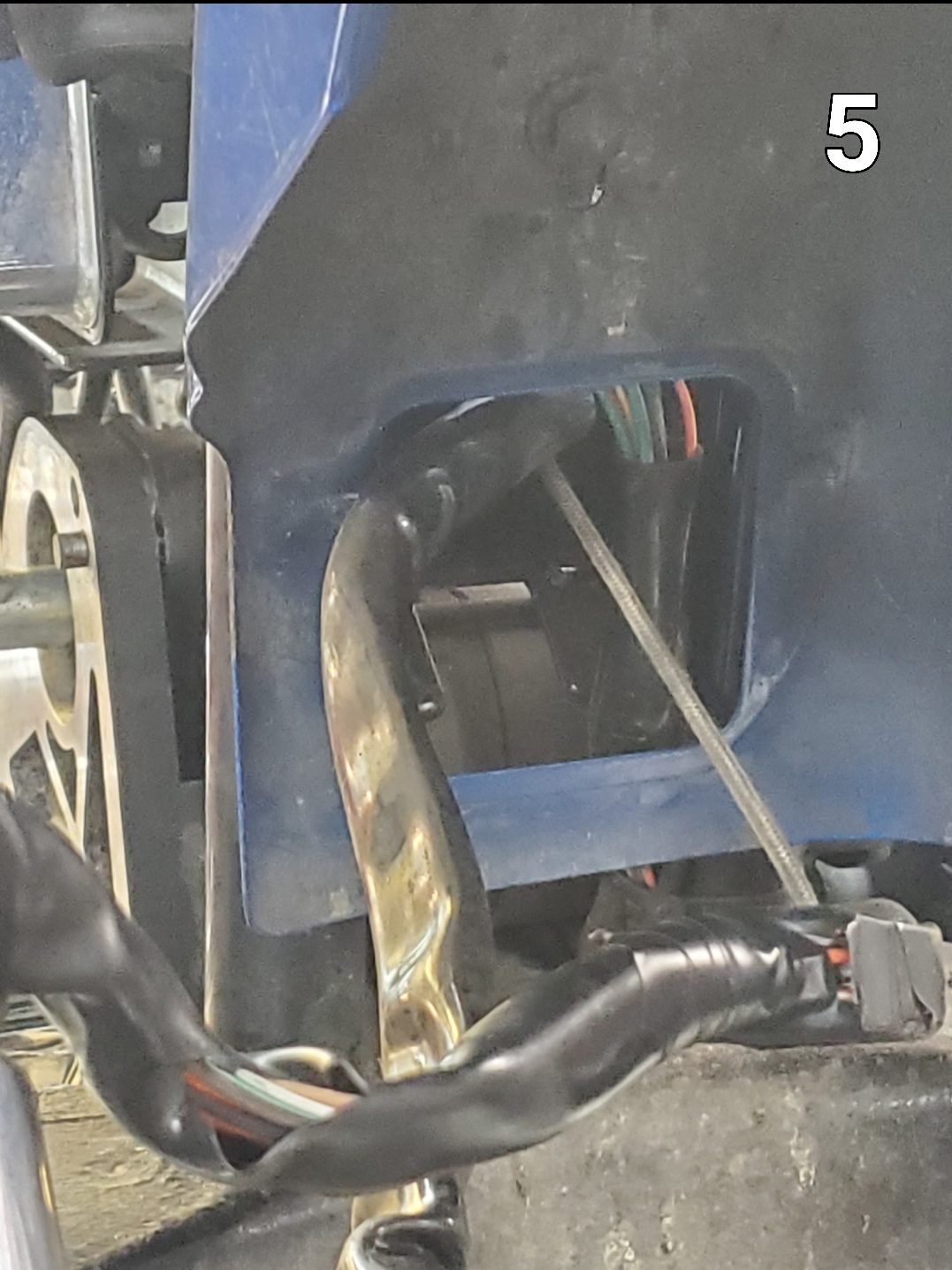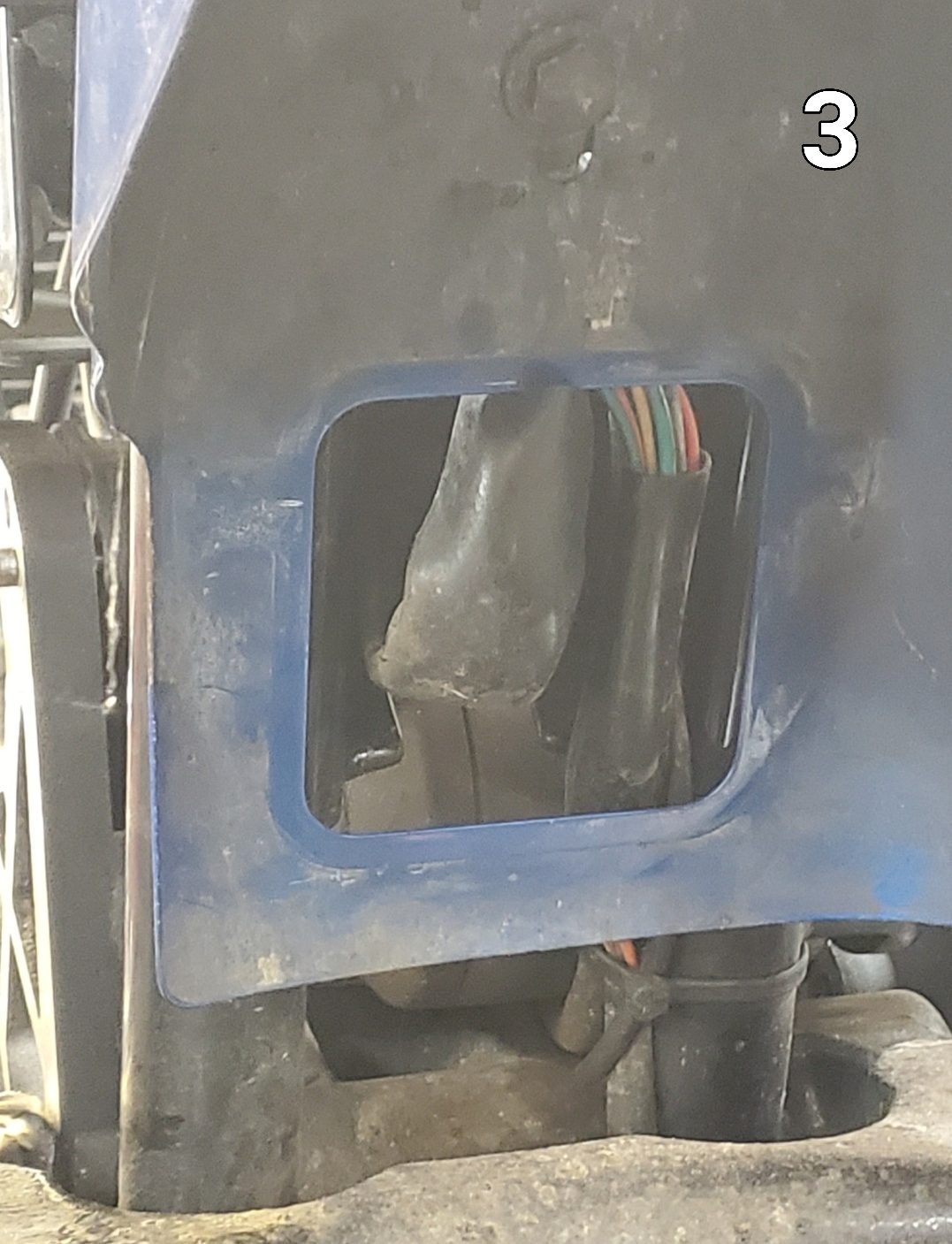 Electrical plugs were removed from the harness on the front end and a string was secured onto the end to help pull the harness back after repairs were made (4). Only the plug for the indicator harness was left on for this repair.