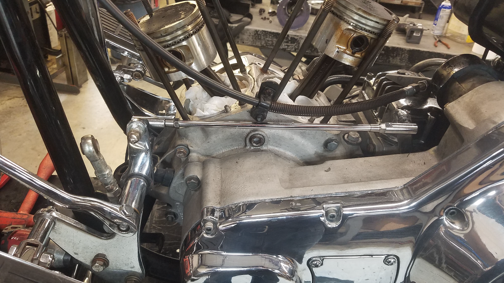 We grabbed a James Gaskets complete top end gasket kit and a couple cans of brake cleaner and began disassembly and inspection. We start by removing the fuel tank, exhaust system, top motor mount, and carburetor with intake assembly. We support the bottom of the crankcase with a flat jack and a small wood block. Then, the front motor mount is removed and the jack lowered in order to remove the rocker boxes and rocker box hardware. (Lowering the front of the motor may only be needed on FXR and some Touring models) When the lower rocker boxes are removed, the top end is "unloaded" and the pushrods and pushrod tubes can be removed.