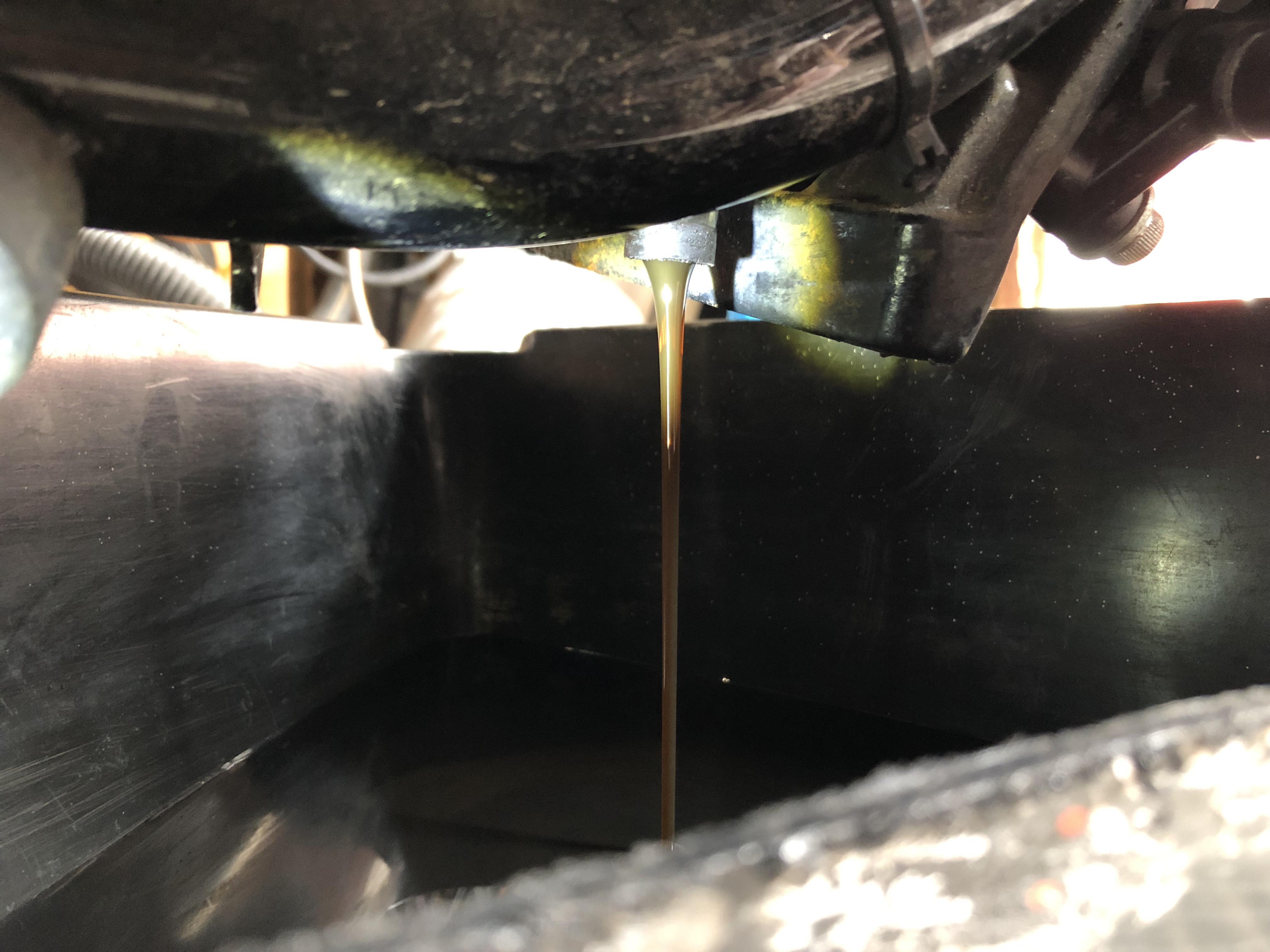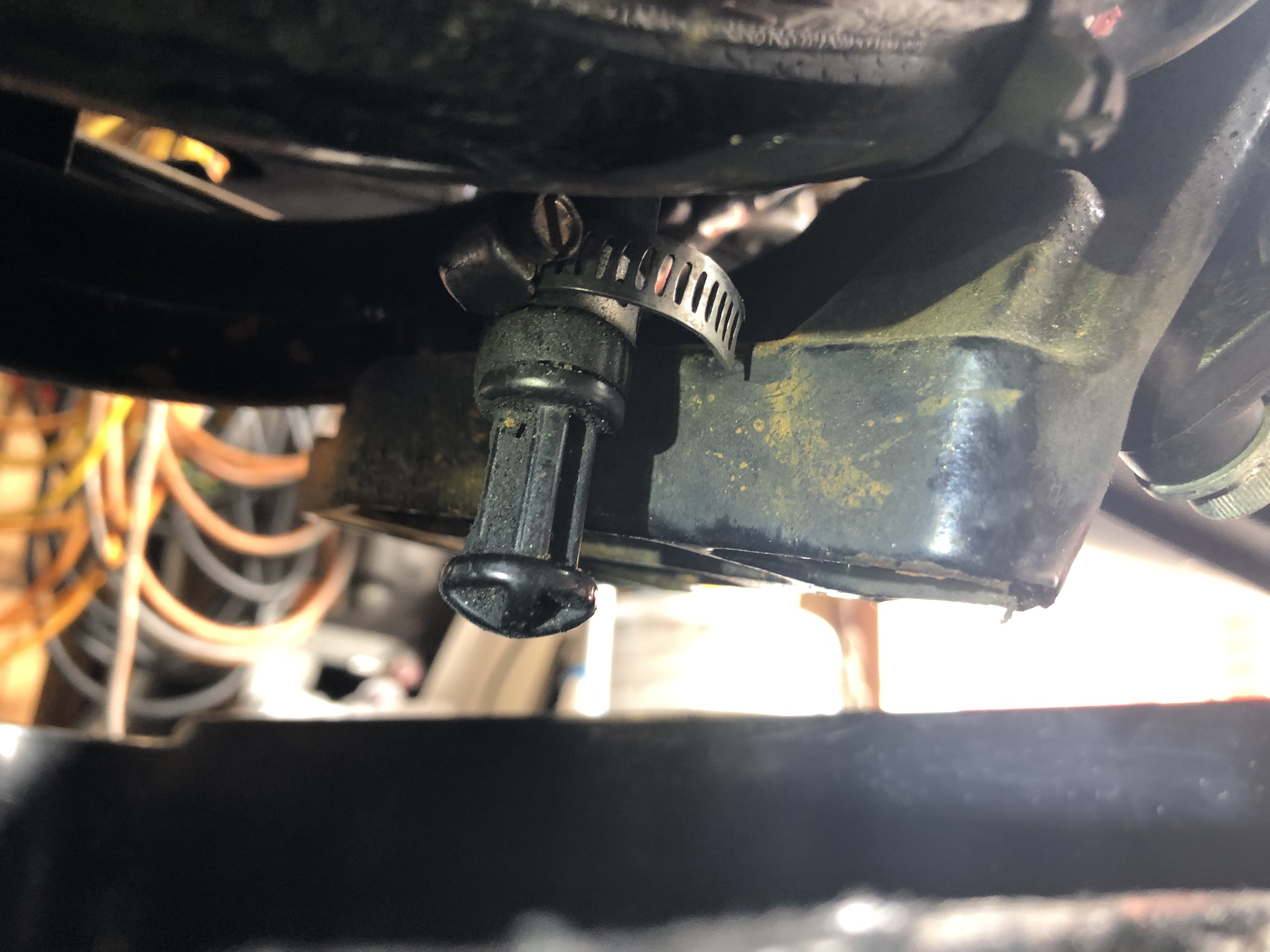 Drained the oil - on the XL it's very easy, hose clamp and plastic plug. I cleaned the filth off the tube, clamp and plug then removed over a drain pan. Pan should hold at least 4 quarts(that is not how much comes out). I cut a pan so it fits under while on the jiffy. The fill cap(dipstick) was removed for ventilation.