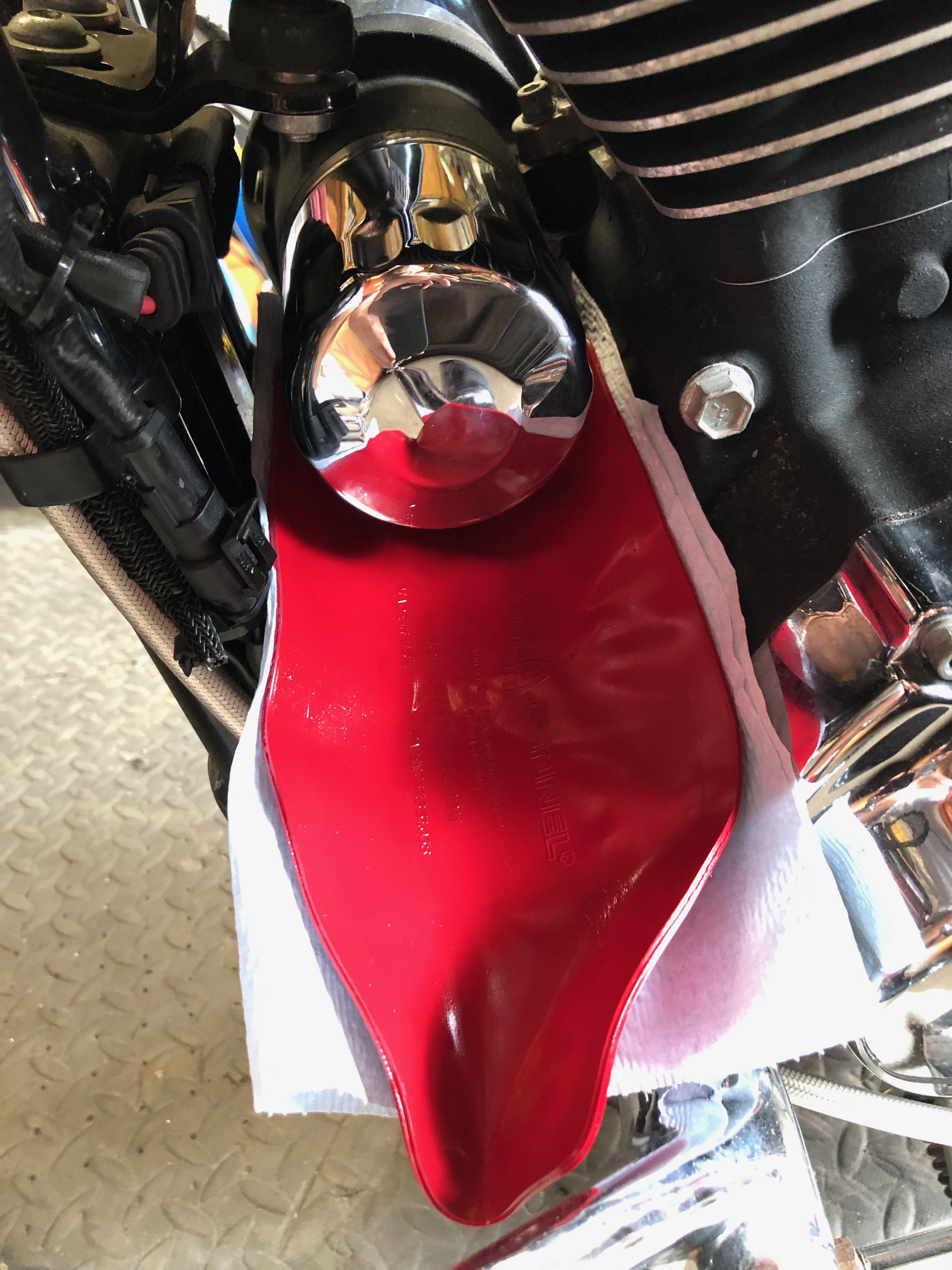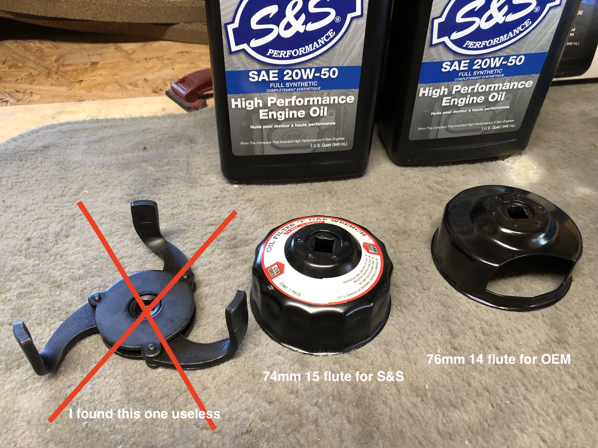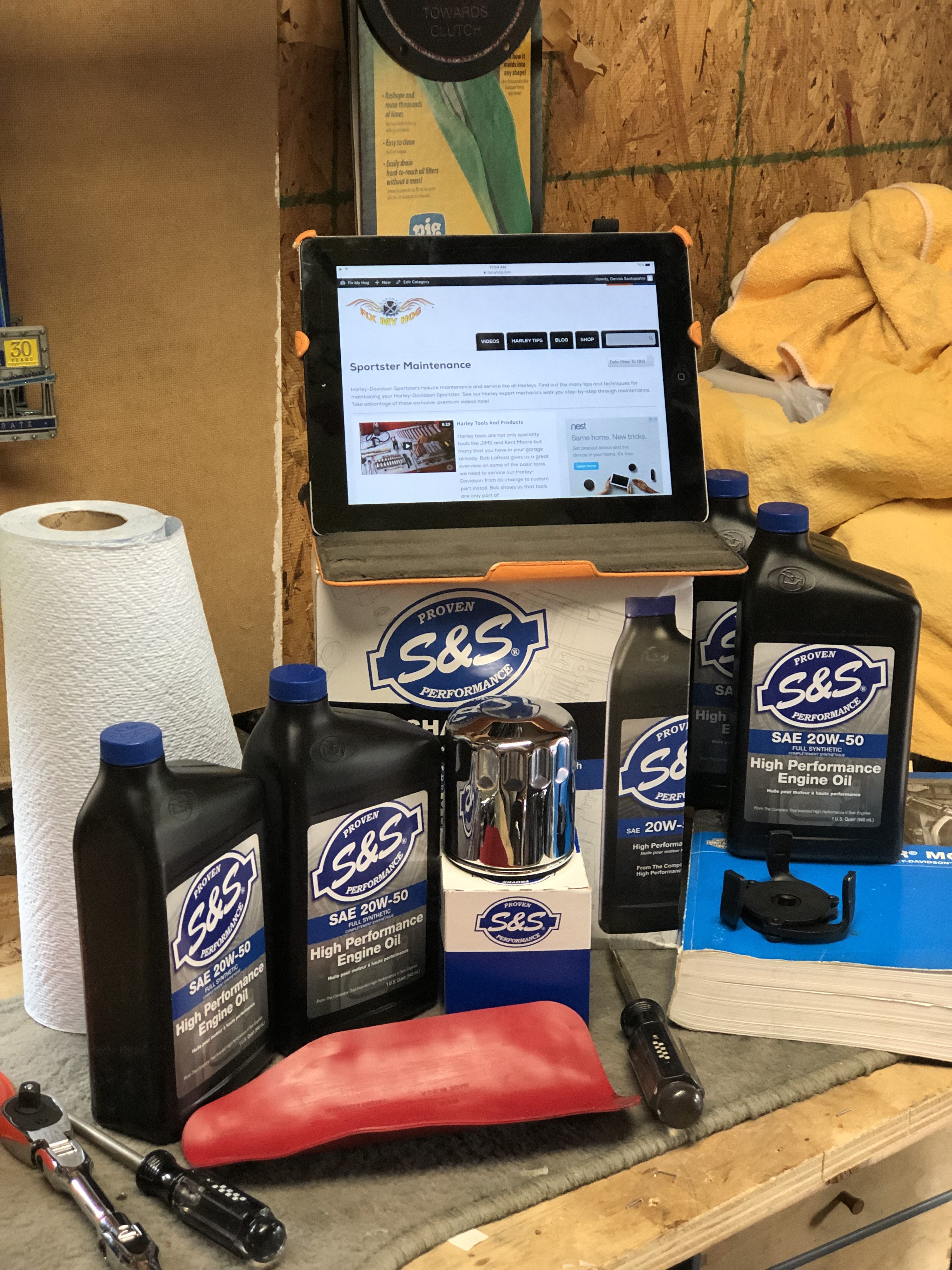 I gathered a few tools and other products. Fix My Hog on my iPad, service manual, flat blade, cleaning supplies, flexible funnel(I use under oil filter), regular funnel, ratchet, extension, new oil filter claw type wrench(sucked), OEM size oil filter cap wrench and S&S size oil filter cap wrench(need to have to remove for next service).