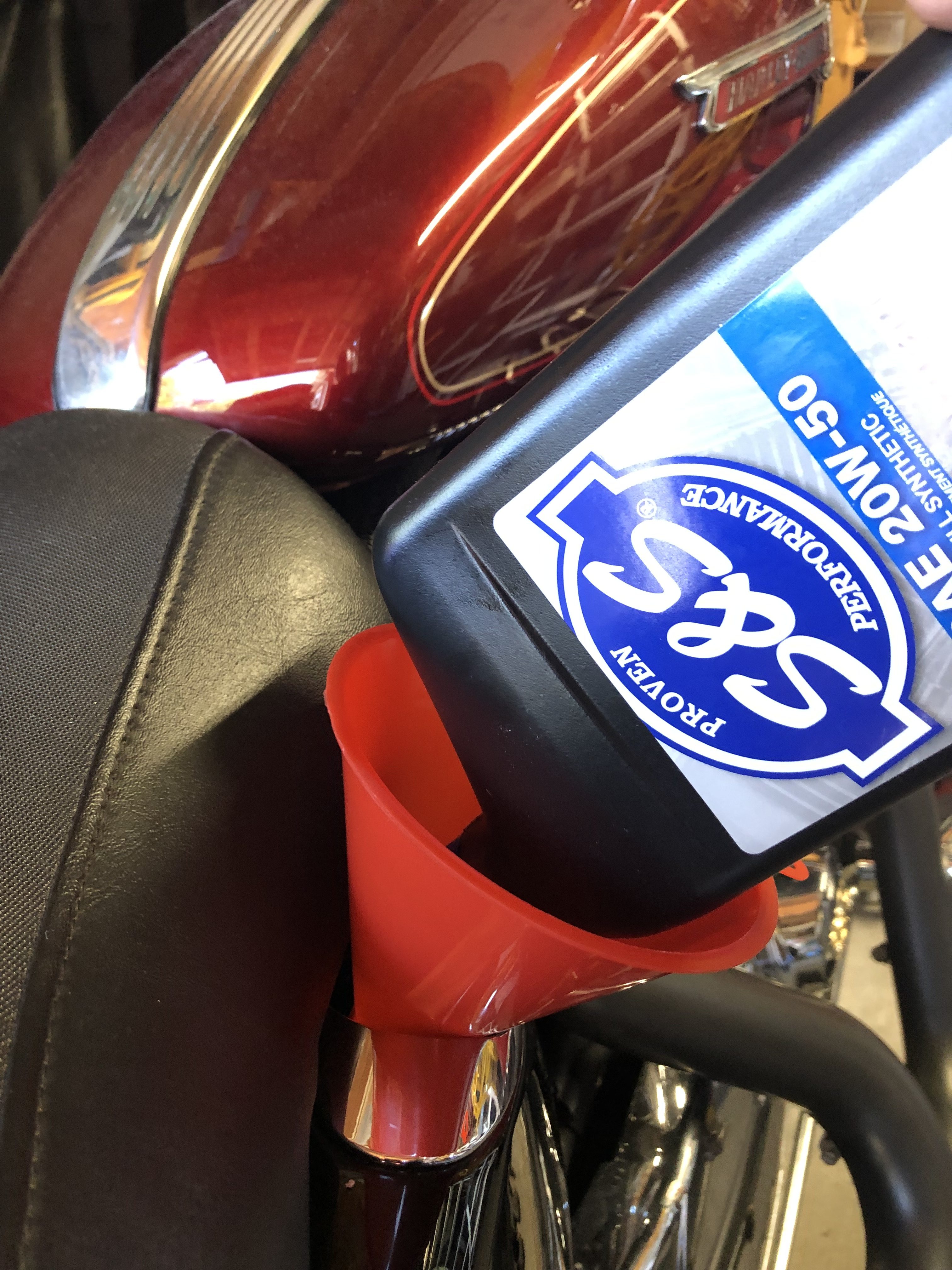 Filled Oil tank with fresh S&S SAE 20W-50 Full Synthetic - High Performance Engine Oil. I used a clean funnel and added 2 quarts - check your manual for your year and model. My total is 2.8 quarts but you do not want to over fill. The 2 quarts and the amount I put in the filter got me close to the right amount.