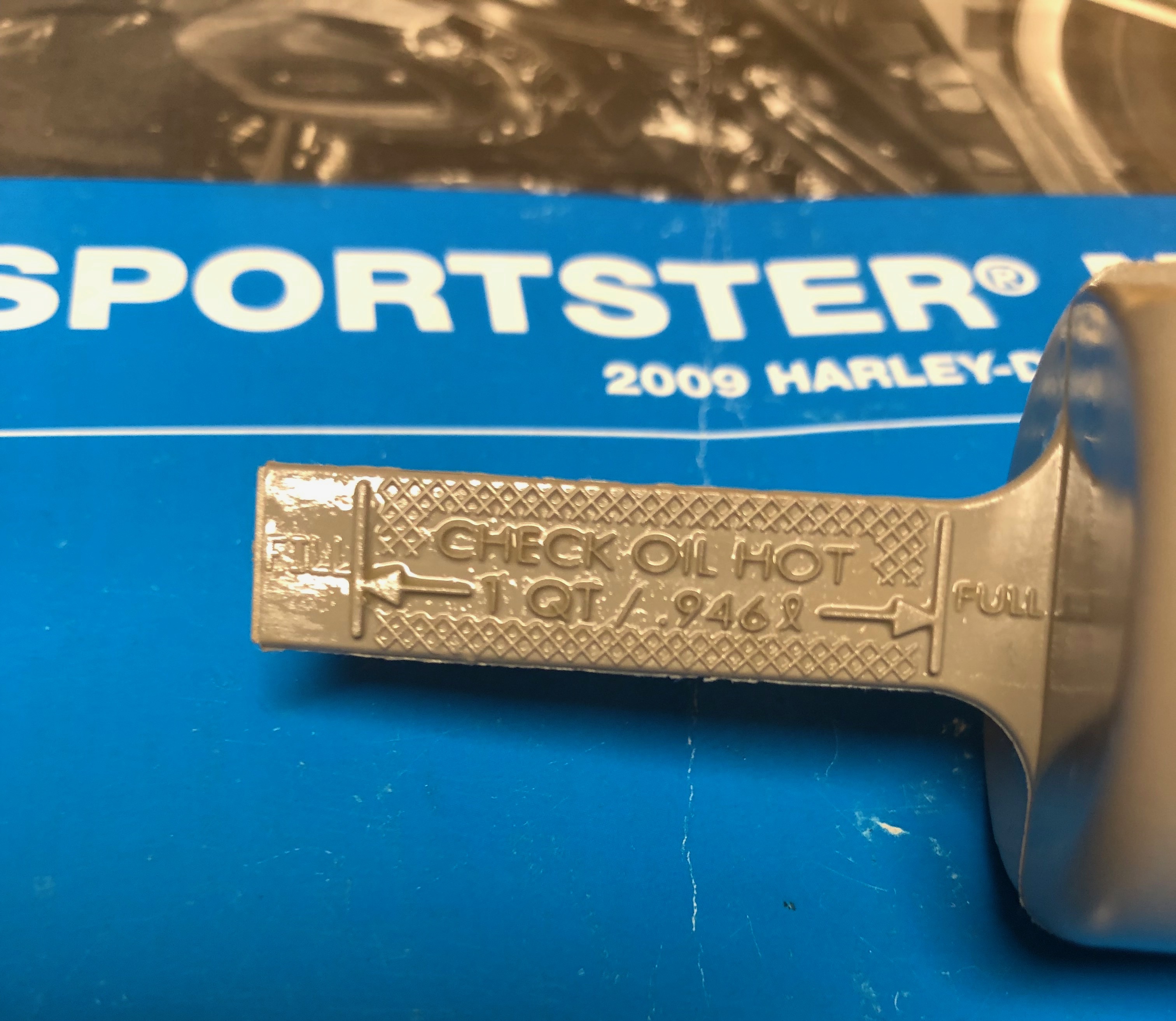 Warmed up the motorcycle, checked the dipstick to bring to proper level on jiffy stand. A little low, added a few ounces, easier to add in small amounts and recheck then drain if overfull. See image of dipstick - check oil hot.