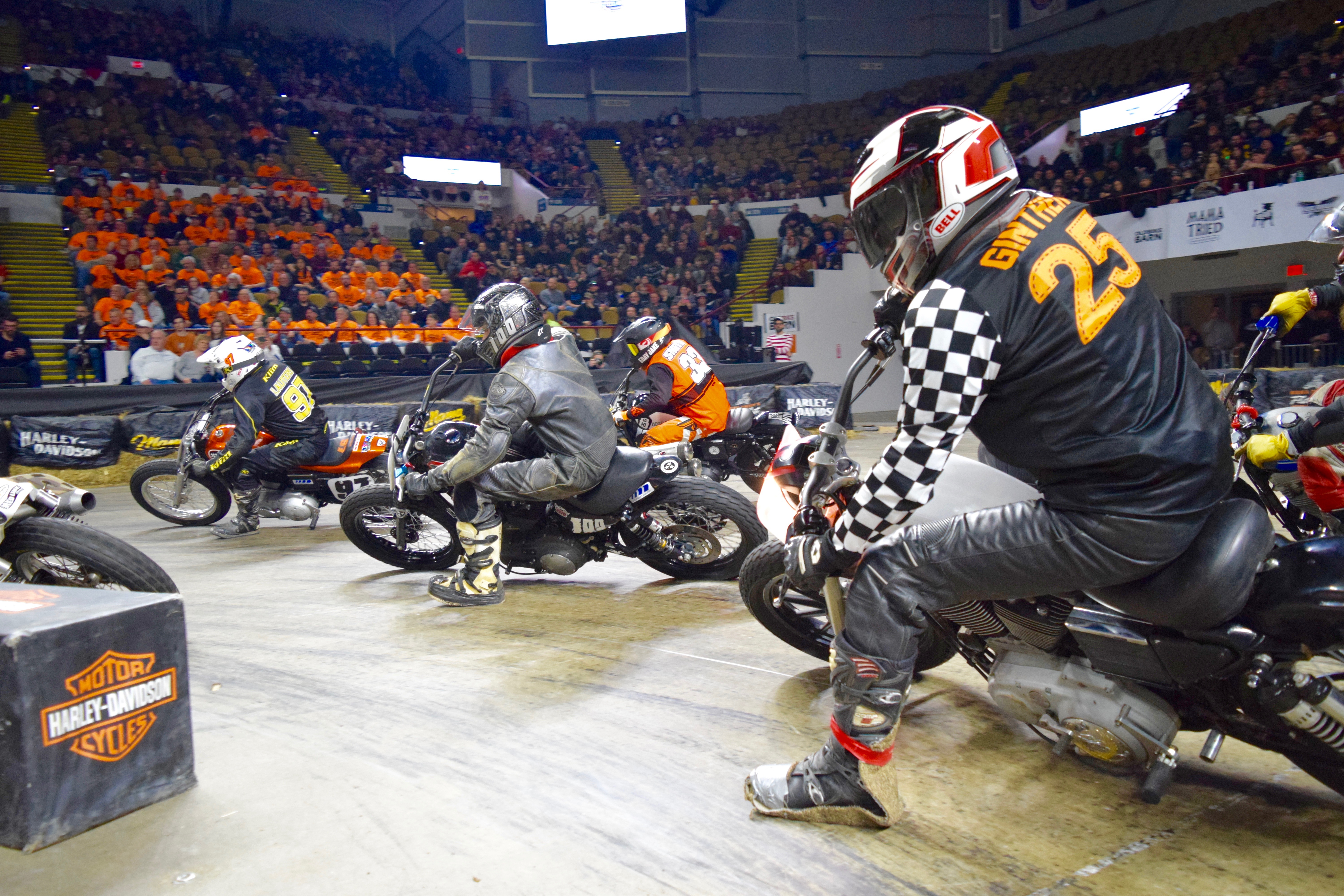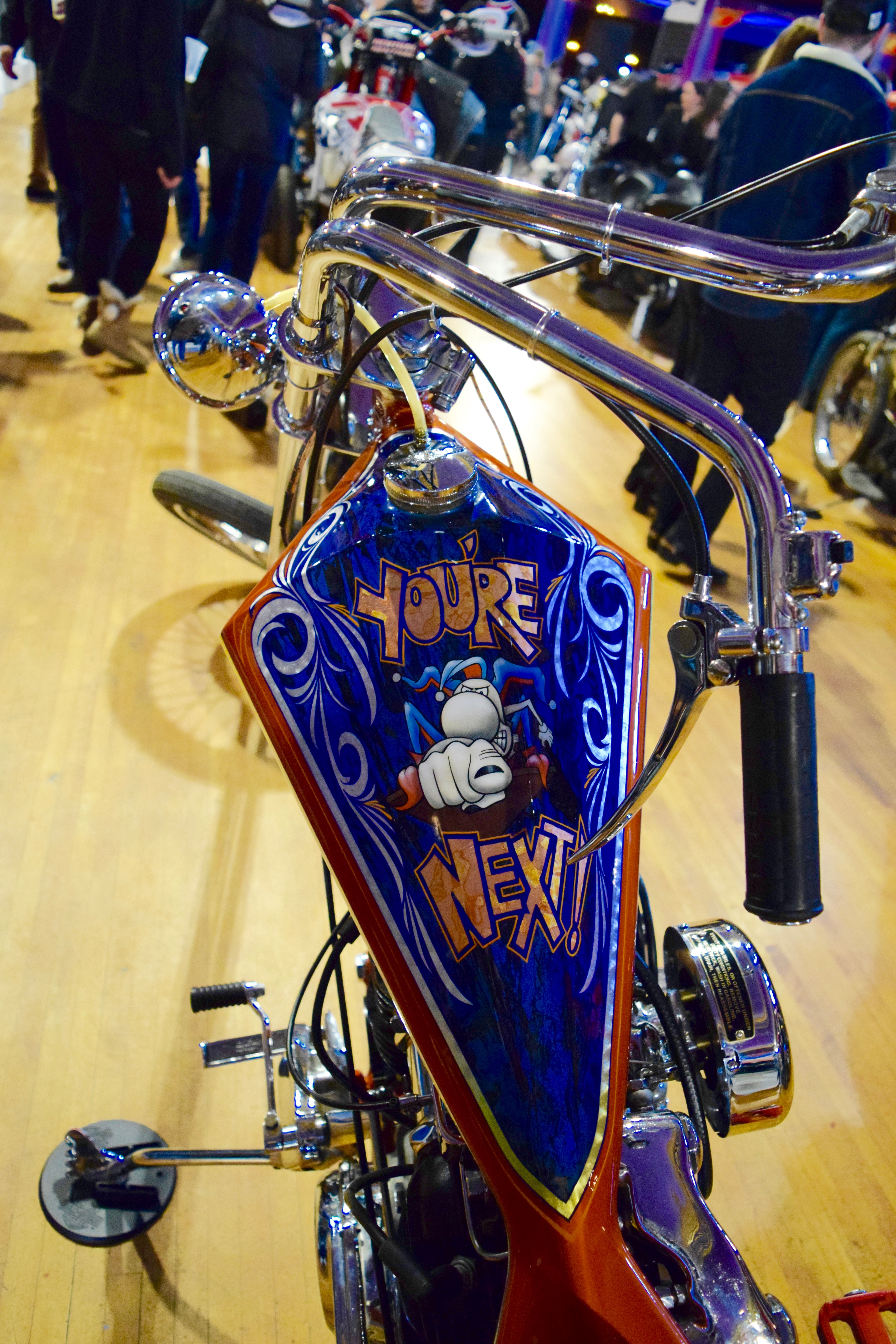 The second, and more rowdy, pre-party is hosted at Fuel Cafe by Mama Tried founder and Fuel Cafe Owner Scott Johnson. This pre-party, the less family friendly of the two, kicked off at 9pm. I arrived there around 9 and it was already wall to wall people, complete with a DJ spinning Black Sabbath and Metallica tunes that drowned out the buzz of tattoo guns going in the upstairs portion of the bar for those looking to get some ink done. Walking in I noticed a sign above the bar that stated “No Motorcycles Allowed On Bar”, which if you were at the pre-party last year, you witnessed bikes being jumped OFF the bar top! Assuming this year would be more mellow, I made my way to the bar and ordered a drink. I couldn’t even get one sip down before I was proven wrong as I heard boonie bikes coming in the bar complete with a jousting lance. After doing a quick ride around the circular bar, they completed this years initiation with a burnout as the crowd roared. Assuming the antics were over, I bellied back up to the crowded bar, found a seat and chatted with the awesome couple from Key Rose Customs jewelry who drove up from St Louis for the show. I was soon proven wrong to assume for a second time that the antics were over when I heard a Harley engine roaring in through the front door and lighting the back tire up. It was ridden by none other than ex-Hooligan racer and madman behind the bars, Mark the Butcher. You may know him from racing, his company Rusty Butcher, or seen his stunts, and it was all too fitting for him to be doing a burnout in the middle of a packed bar in the dead of winter in Milwaukee. He too then kicked off the start of Mama Tried with a lap around the bar narrowly squeezing the Sportster between people and barstools. This is the spirit of Mama Tried.
