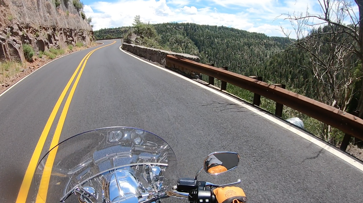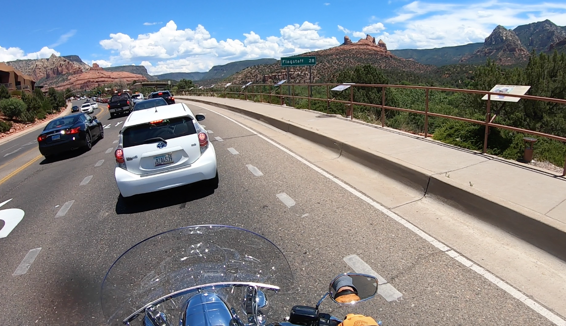 Riding up Interstate 17 was a great way to get to know the bike before getting to the twisty’s just past Sedona. I exited Interstate 17 onto 179 and headed north into Sedona. Everything I had heard about Sedona and its famous red rocks had yet to manifest themselves as the off ramp to 179 looked like the desert just outside of Phoenix. I began to wonder if I had the wrong road as I headed up 179 until I went around a bend and was stunned at the grandeur. The other thing I was stunned at was the stop and go weekend traffic and hordes of people flocking to Sedona, but at least the view was phenomenal. Idling through Sedona in that heat, with the heat off the bike, and the heat off the cars was proving to be a bit much so a lunch stop was in order. As I putted through Sedona at a breakneck speed of 2 miles per hour, it soon became apparent that not only was the road packed, but also every store and restaurant with lines out the doors and waits so long I wouldn’t make it to the Grand Canyon in time. In the words of Jerry Jeff Walker I kept on keeping’ on through Sedona and onto 89A with everyone else and remained in traffic for most of the ride until it finally broke up just north of Slide Rock State Park. The road after that goes through twisty’s that reminded me of Independence Pass in Colorado. Tight switchbacks, 15mph limit, cliff on one side with a drop off on the other. The extra weight of the Road King really showed at this point and had me wishing I was on a Heritage or better yet, my Sportster. The view however is second to none and makes you want to slow down to take it all in.