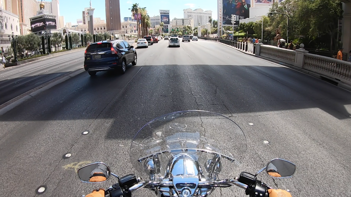 Waking up the next day, I packed my saddlebag full of bottles of water and energy bars and pulled out ready for the hottest ride of my life. There is really not much more than gas stations in between Tusayan and Las Vegas so pack ahead of time. Kingman, Arizona is about the half way point and has some options however limited. With the extreme desert heat, heat coming off eighteen wheelers and cars, I had to pull off about every 45 miles to drink a bottle of water and pour another bottle over me. 282 sweat drenched miles later I found myself in Las Vegas riding down the Strip.