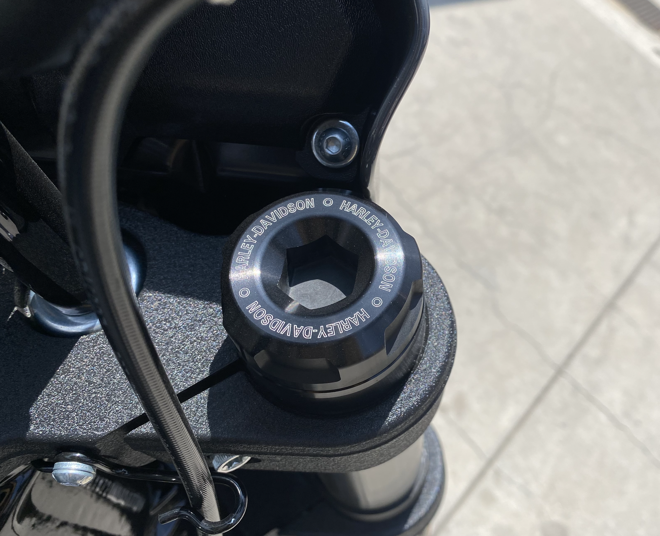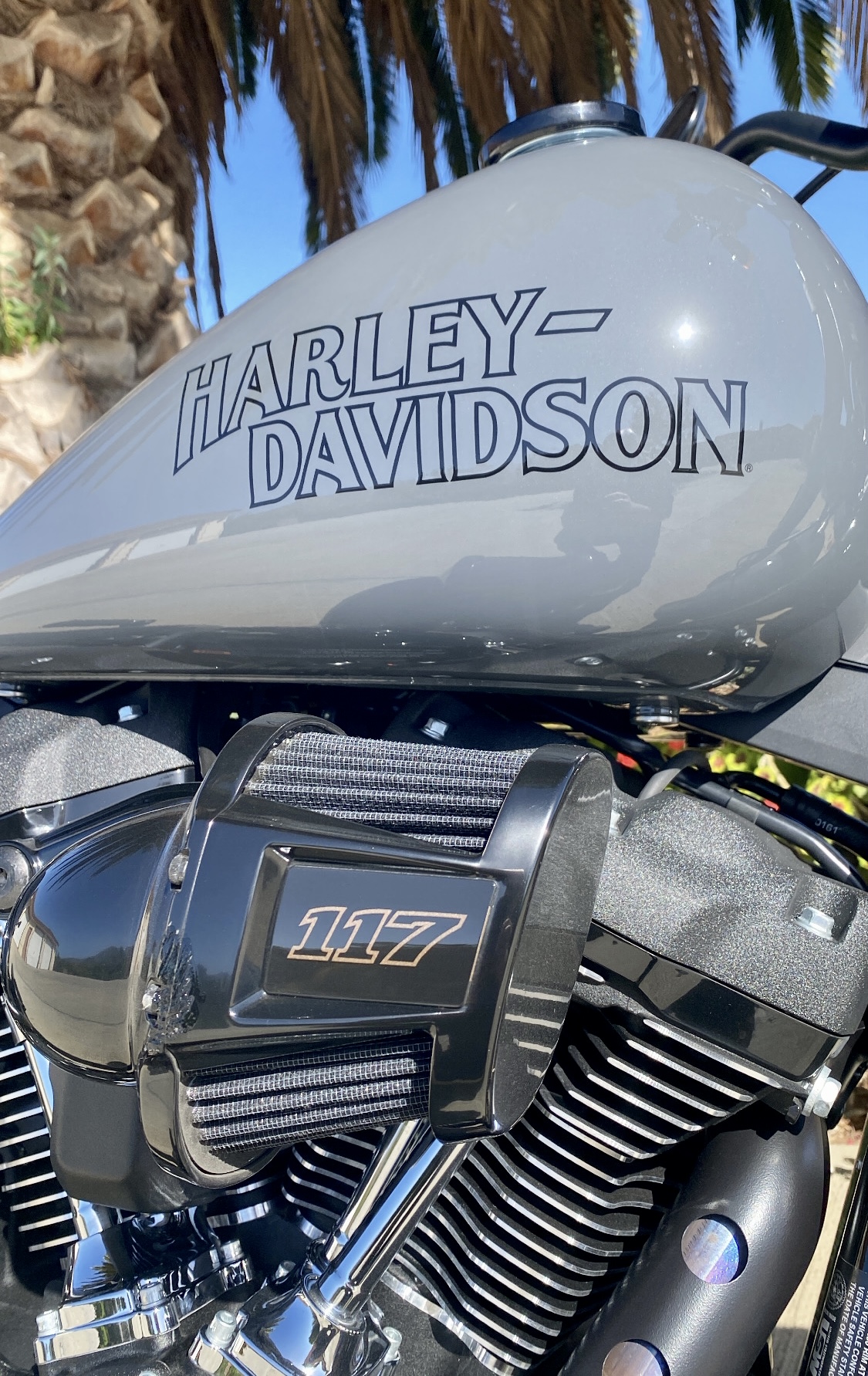 While a larger motor and suspension upgrades are the main selling points for the new 2022 Low Rider S, ergonomically and aesthetically HD has also put their nose to the grindstone. In previous years tank mounted gauges were stock and while I liked the lines and the side profile look these created (not to mention they’re classic), when riding the bike aggressively, a quick view to the tach was no easy task. Harley changed this in 2022 combining the speedo and tach into one gauge, an analogue tach with an electric speedometer mounted directly on the bars. What the Low Rider S lost in nostalgia, it gained in functionality. To combat the loss of gauge nostalgia, HD design department stuck with the classic logo on the tank. While the big changes are the most noticeable, it’s the small detail touches that make the difference. The FXLRS badge on the top of the tank is done with the same bronze flake paint as the 117’’ badge that adorns the intake which matches the bronze flake painted bar and shield on the timing cover. This trio visually ties the bike together thematically. Going one step further, the MoCo has also done away with boring plain fork tube tops and added a more stylized top for a finished look. It’s these little premium detail touches that keeps the eyes on the bike long past a first view.